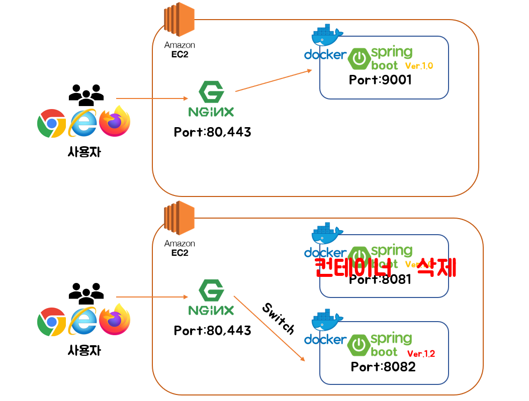 - ๋ง์ฝ ๋ฐฐํฌ์ ๋ฌธ์ ๊ฐ ์๊ฒจ์ rollback์ด ํ์ํ๋ฉด ngix๊ฐ ๋ฐฐํฌ์ ์ ์ฐ๊ฒฐ๋์๋ ์คํ๋ง๋ถํธ๋ฅผ ๋ค์ ์ฐ๊ฒฐํ๋ฉด ๋๋ค.