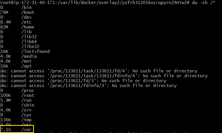 /var ์์ 7.1G ์ฐจ์ง, ์ด 7.6G์ธ๋ฐ 5G๋ฅผ ์ ์ธํ ๋๋จธ์ง๊ฐ ๋ค /var์์ ์คํ๋๊ณ ์๋๊ฒ์ด๋ค.