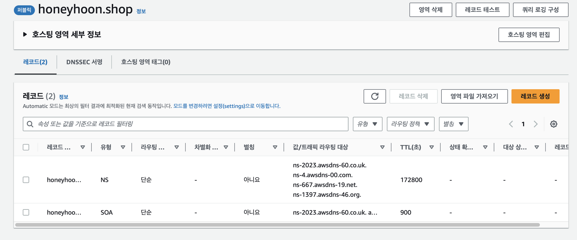 ํธ์คํ ์์ญ์ ์์ฑํ๊ฒ ๋๋ฉด NSํ์ ๊ณผ SOAํ์ ์ AWS์์ ์๋์ผ๋ก ์์ฑํด์ค๋ค.